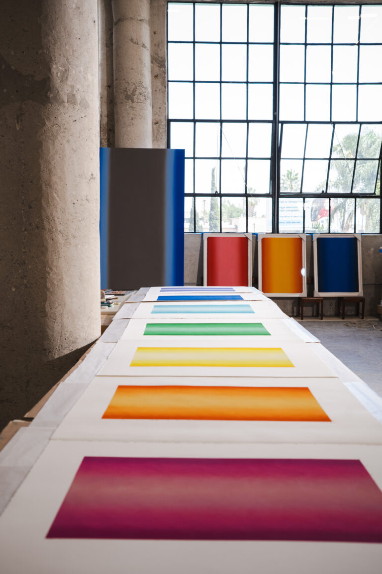 Inside her high-ceilinged studio, sunlight poured through a row of windows and landed on the paintings themselves—vast, radiant gradients that seemed to hover in silence. They didn’t just decorate the space; they charged it. Tables in the center were covered with works in progress, thin pastel veils resting over glimmers of raw color.